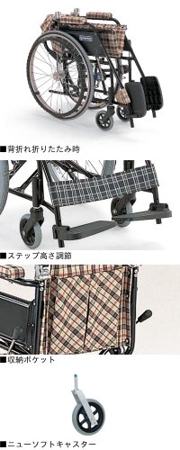 カワムラサイクル KLシリーズ KL22-38 軽量車いす 介助用ブレーキなし 濃紺チェック 座幅38cm 前座高44cm