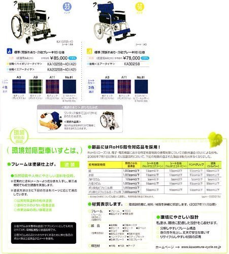 カワムラサイクル KA102・202シリーズ KA202SB-40 標準車いす 介助用ブレーキあり エアタイヤ仕様 背折れ機能あり エコネイビー 座幅40cm 前座高43cm
