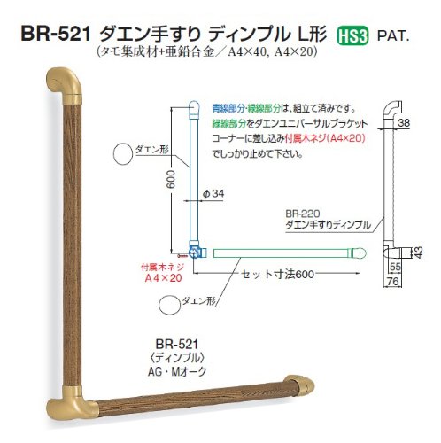 シロクマ 室内用補助手すり(ダエン形) BR-521 600mm ×600mm ダエン手すりL形 ディンプルあり 本体カラー/ミディアムオーク 金具カラー/AG