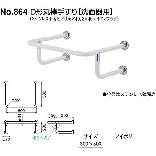 シロクマ 高齢者・身障者用補助手すり No.864 600mm ×500mm 直径34mm 洗面器用D形丸棒手すり アイボリ